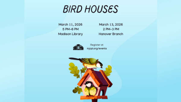 Personalize your very own wooden birdhouse on March 11 at Madison Public Library from 5 PM to 6 PM or on March 13 at Hanover Public Library from 2 PM to 3 PM. All materials are provided, so just bring your imagination! This event is open to adults and young adults. Registration required. Register at mjcpl.org/events or call the Library.